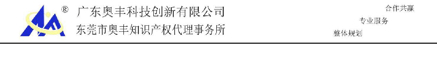 东莞市奥丰知识产权代理事务所是经国家知识产权局、国家工商行政管理总局商标局、国家版权局审 批备案具备知识产权代理资格的专业服务机构,是广东省专利代理行业协会会员单位,东莞市科技局直属 的知识产权服务单位。并于 2017 年与北京汇信合知识产权代理有限公司东莞分公司强强联合,业务覆盖 国内外专利、商标、版权申请代理等基础知识产权业务及知识产权运营服务、知识产权托管服务、知识产 权管理规范体系建设等。为了更加高效专业地为广大客户提供涉外知识产权服务,事务所与国外知识产权 法律机构建立了稳定的合作关系。 奥丰科技服务平台以先进的服务理念,整合各类优质资源,提供基于客户发展需求的各类专业服务, 首创科技服务行业“5S”服务理念,全力打造“广东科技服务专家”。